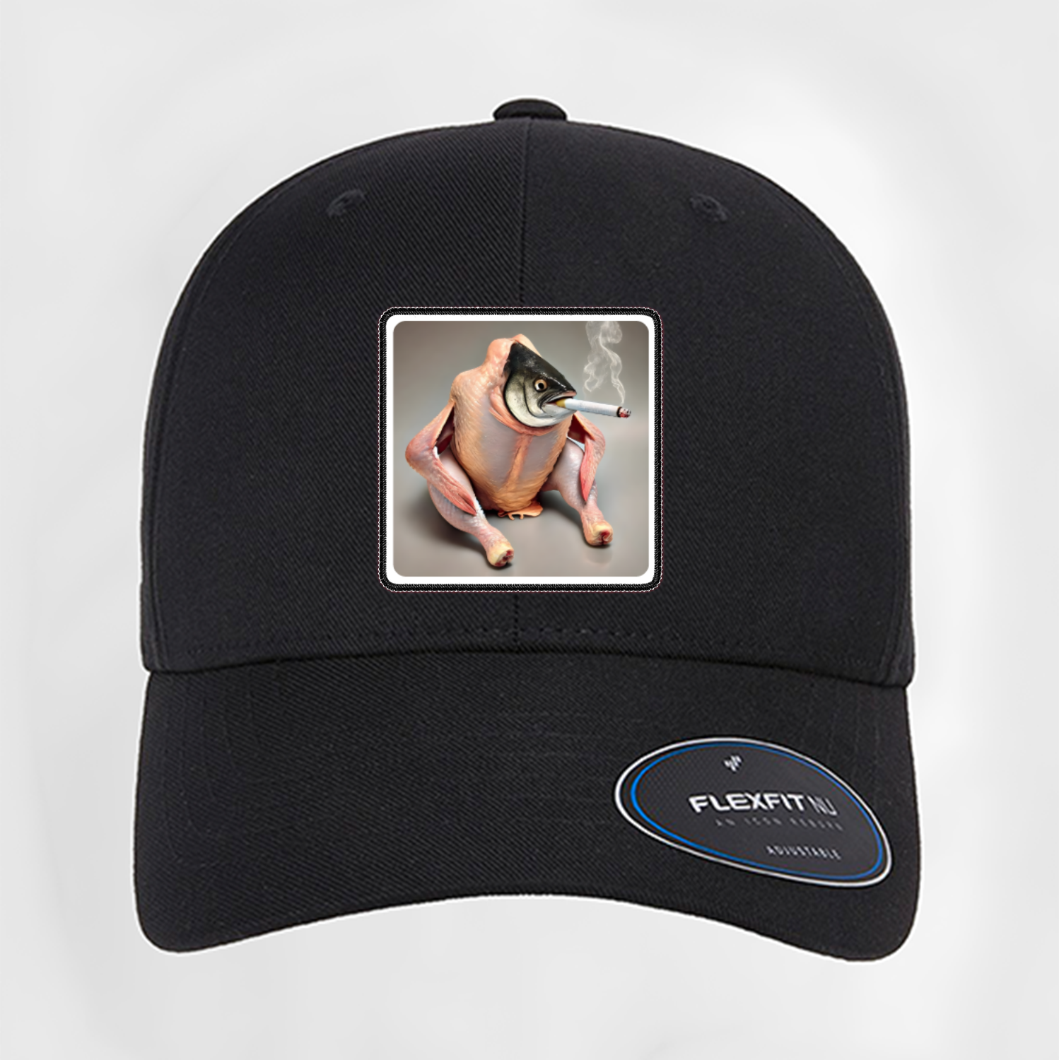 The Smoking Chicken Fish Curved Patch Hat Available in black or grey. One size fits all adults.