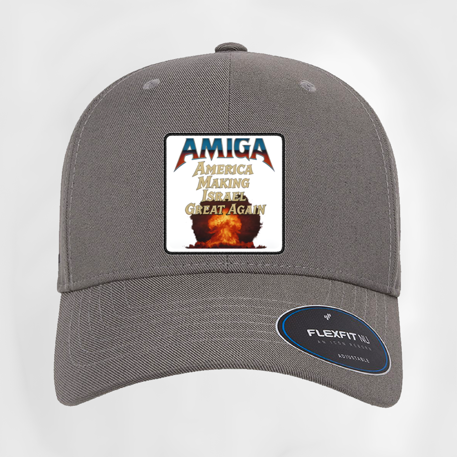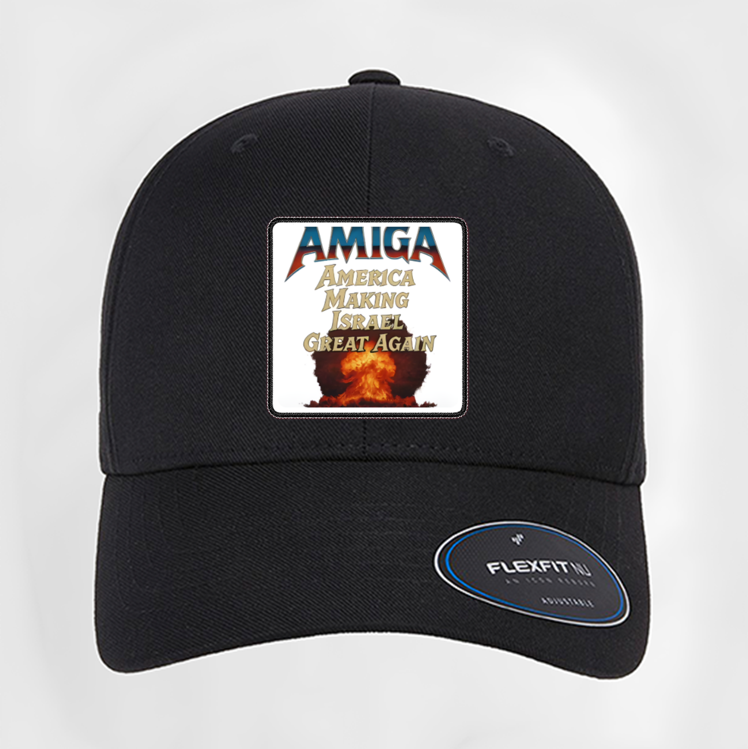 AMIGA - America Making Israel Great Again Curved Patch Hat. Available in black & grey colours and one size fits all.
