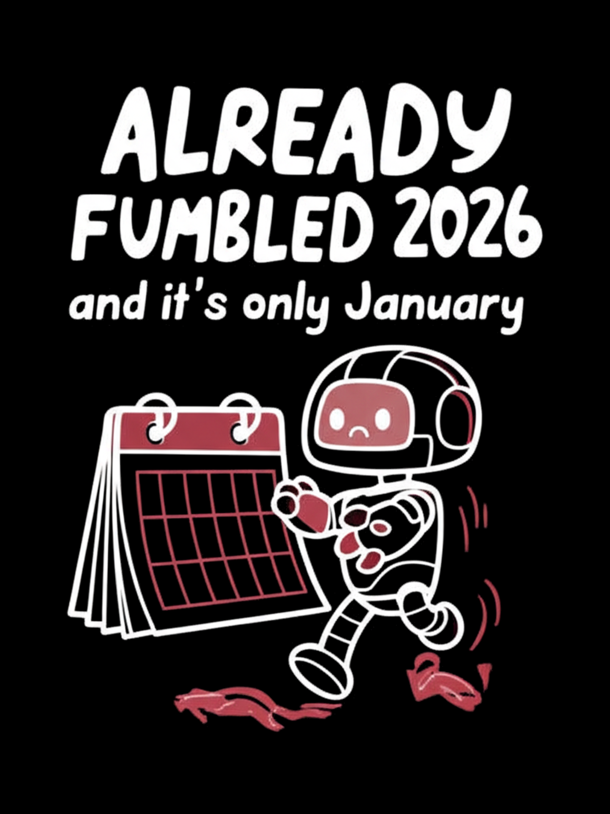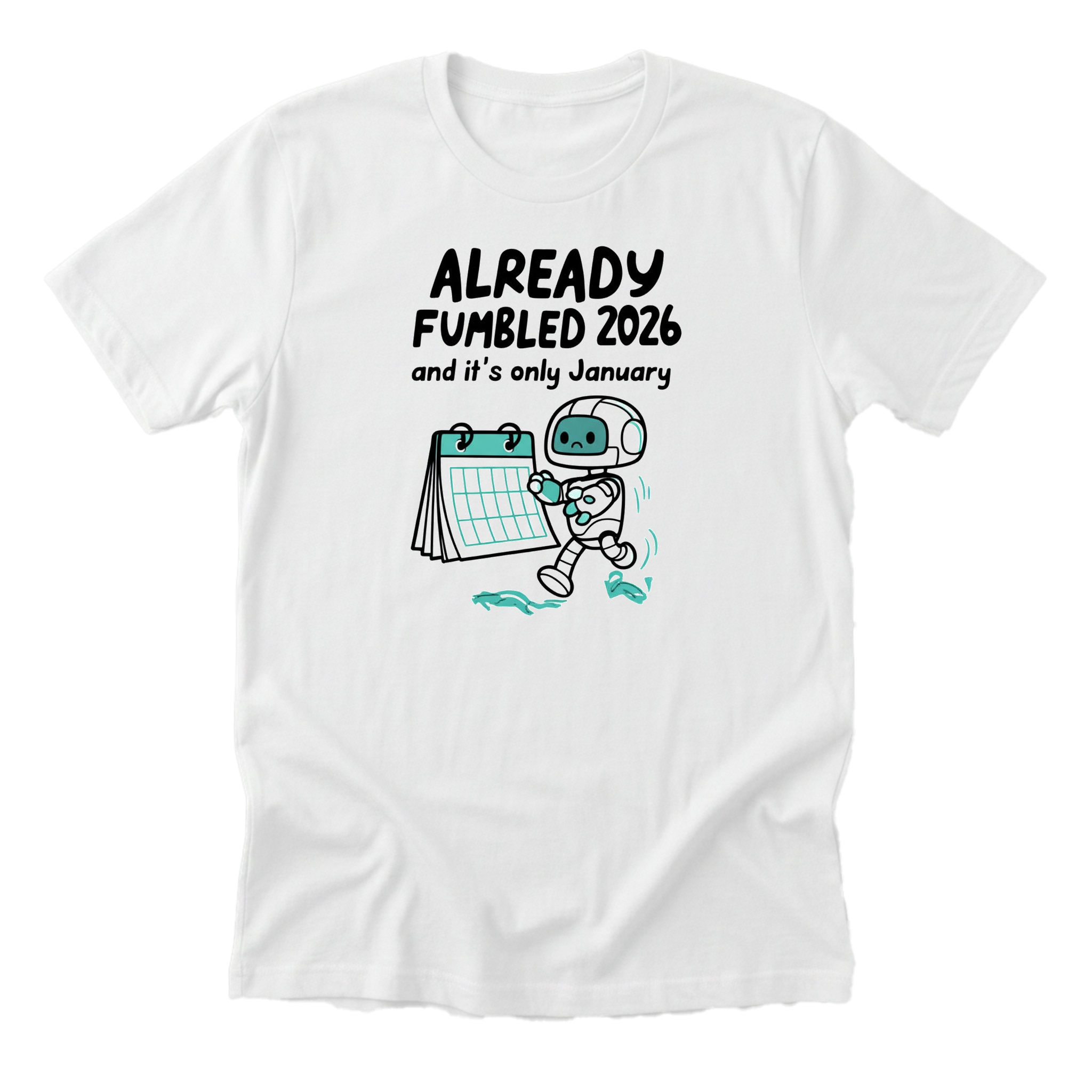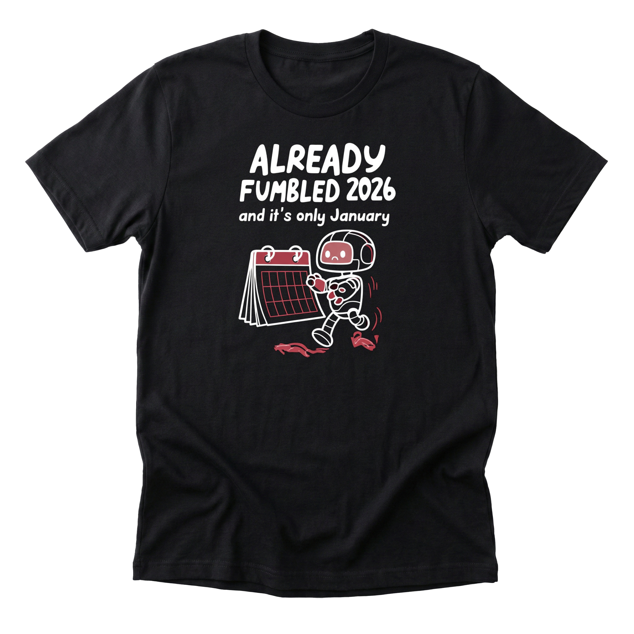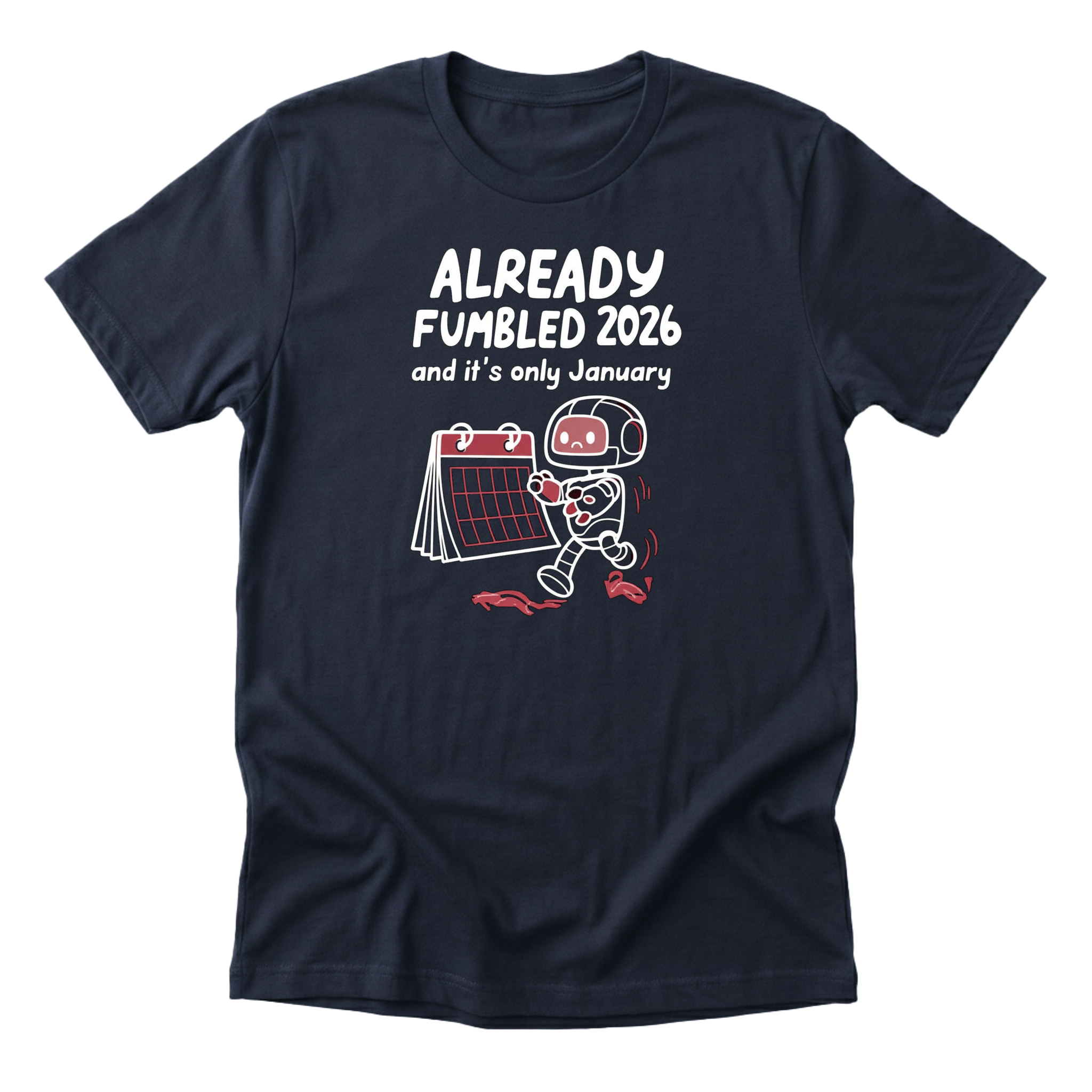 Relatable new year humor for those who started 2026 with high hopes and immediately tripped. Cute chibi robot design on a premium Next Level 6410 tee (60/40 cotton-poly blend).