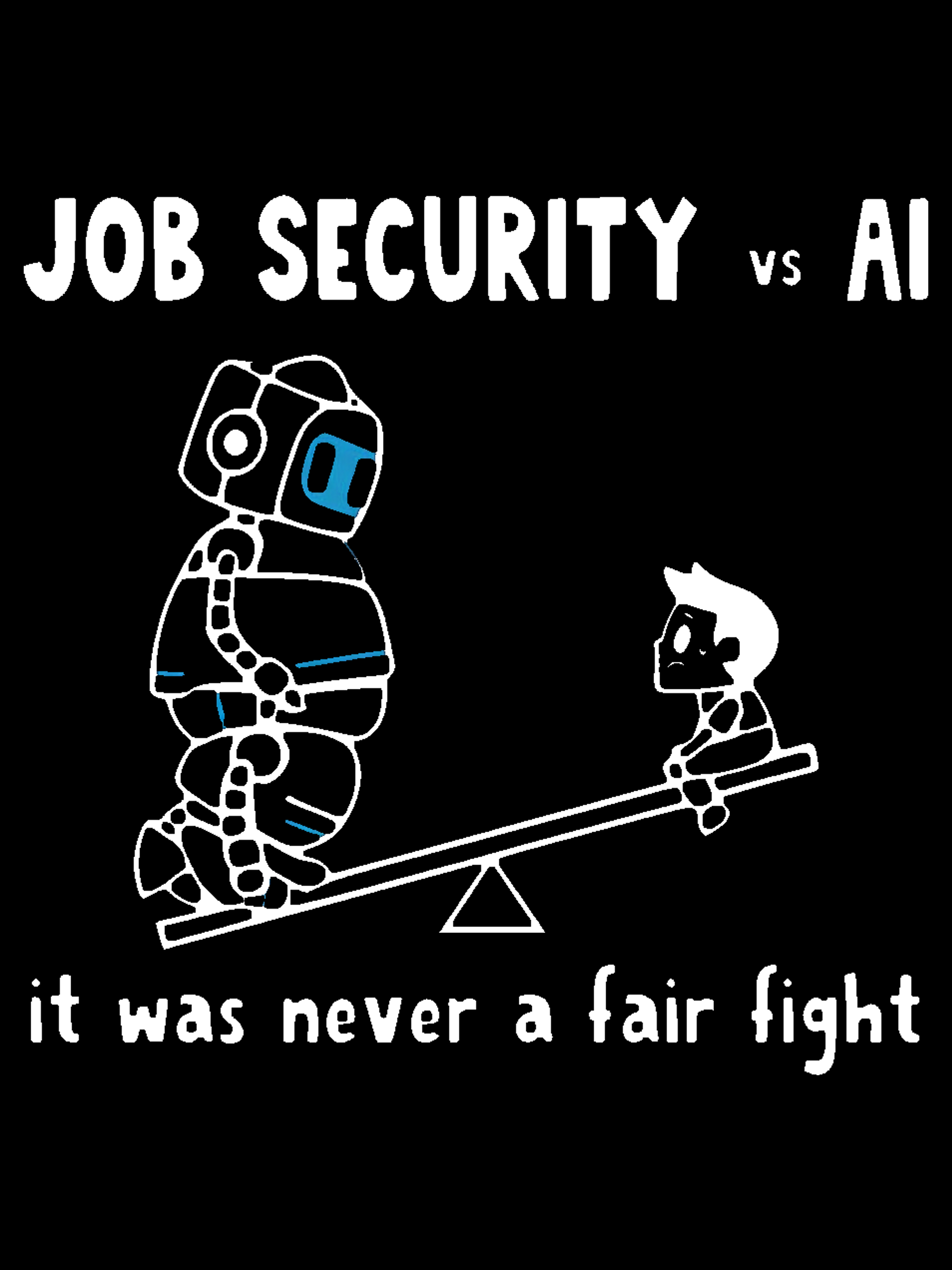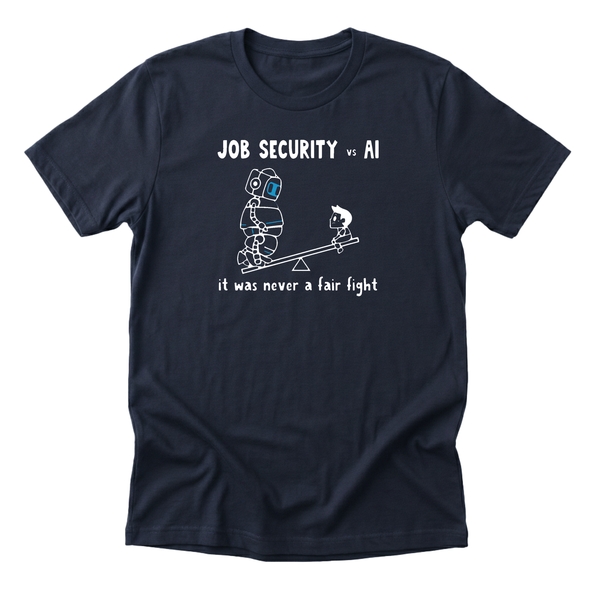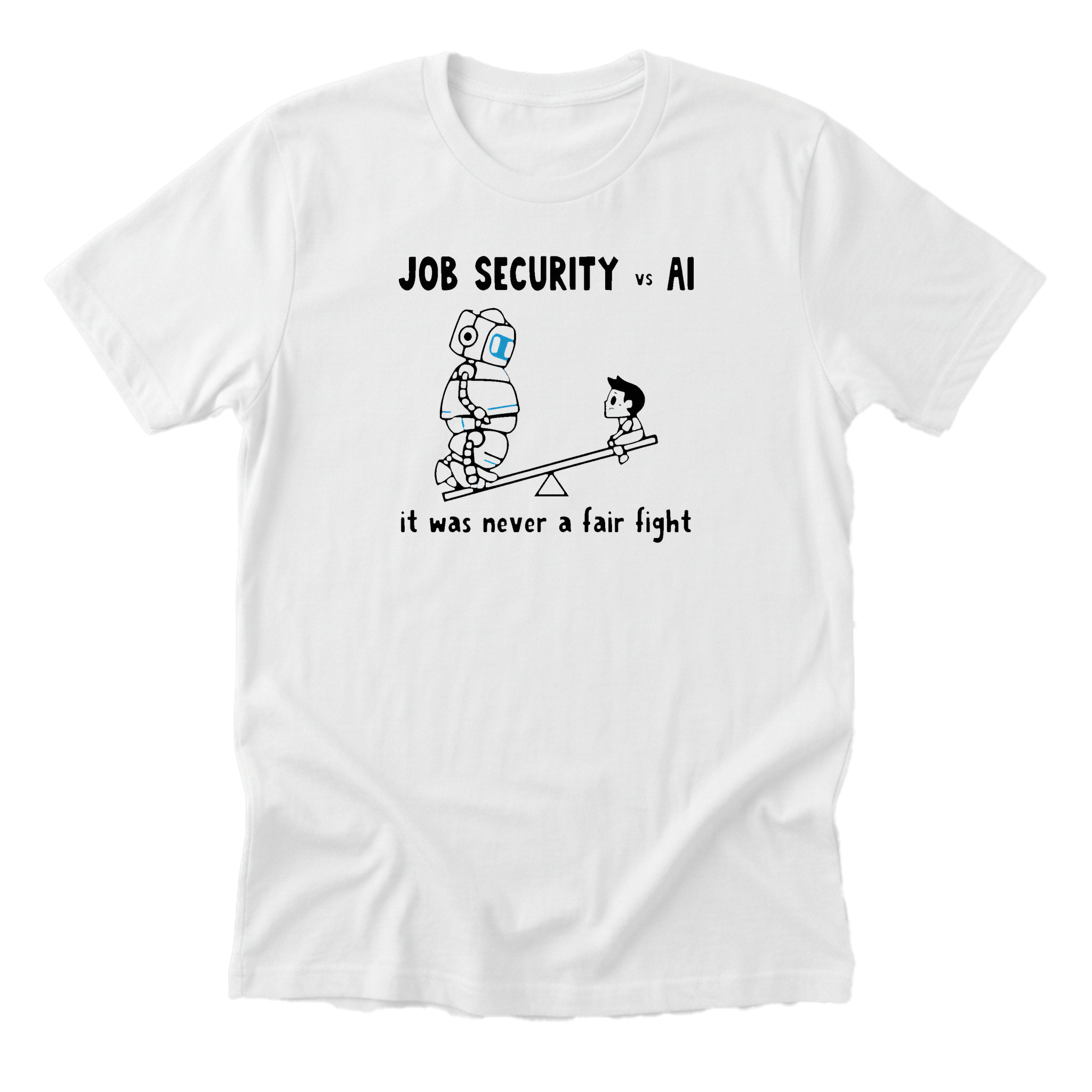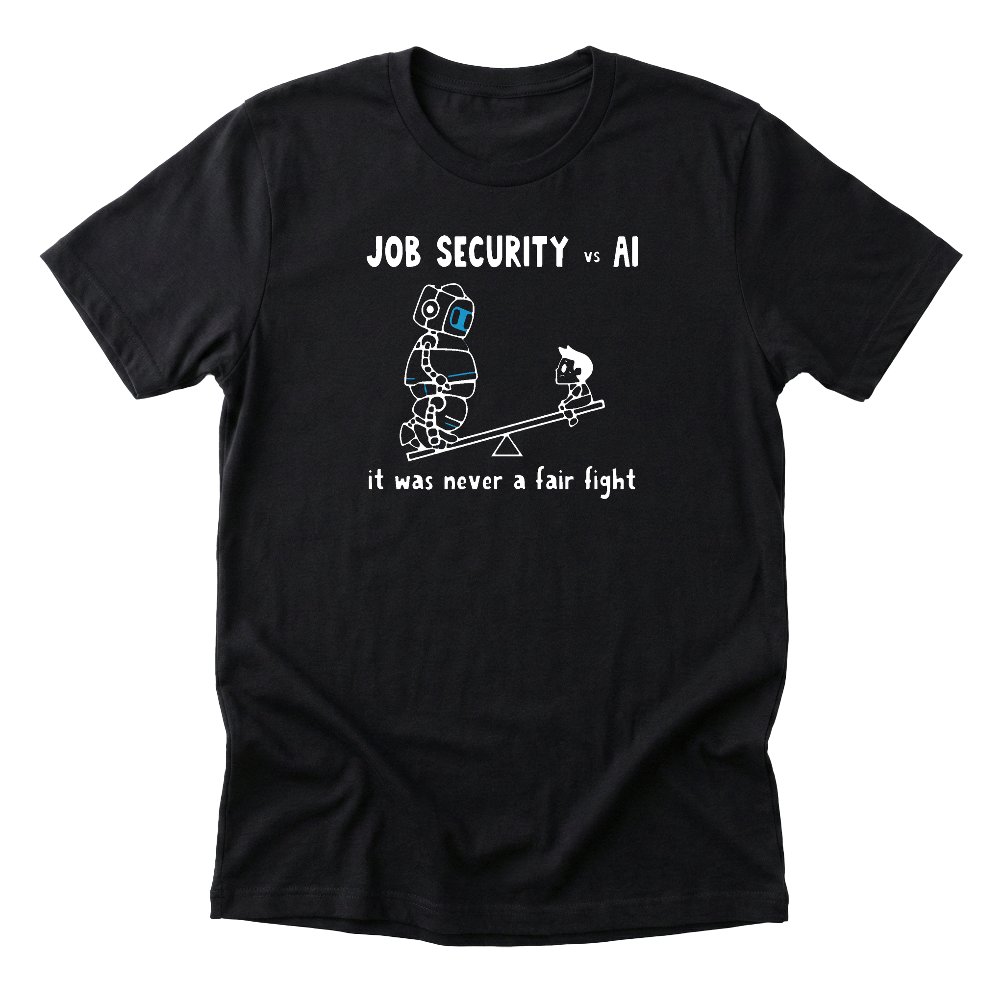 The eternal struggle visualized: job security and AI on a seesaw, and AI is winning. A self-deprecating take on automation anxiety. Premium Next Level 6410 tee (60/40 cotton-poly blend).