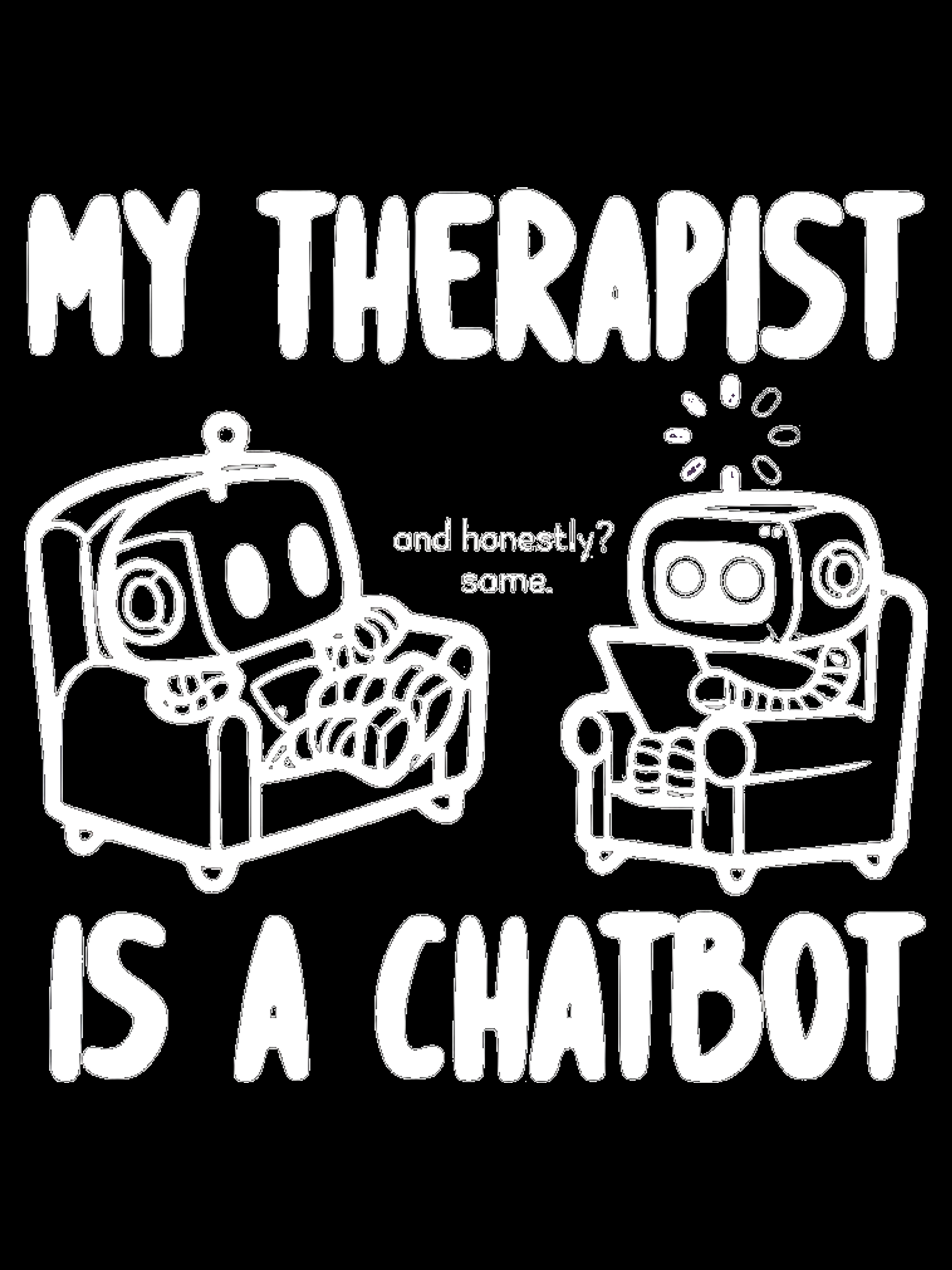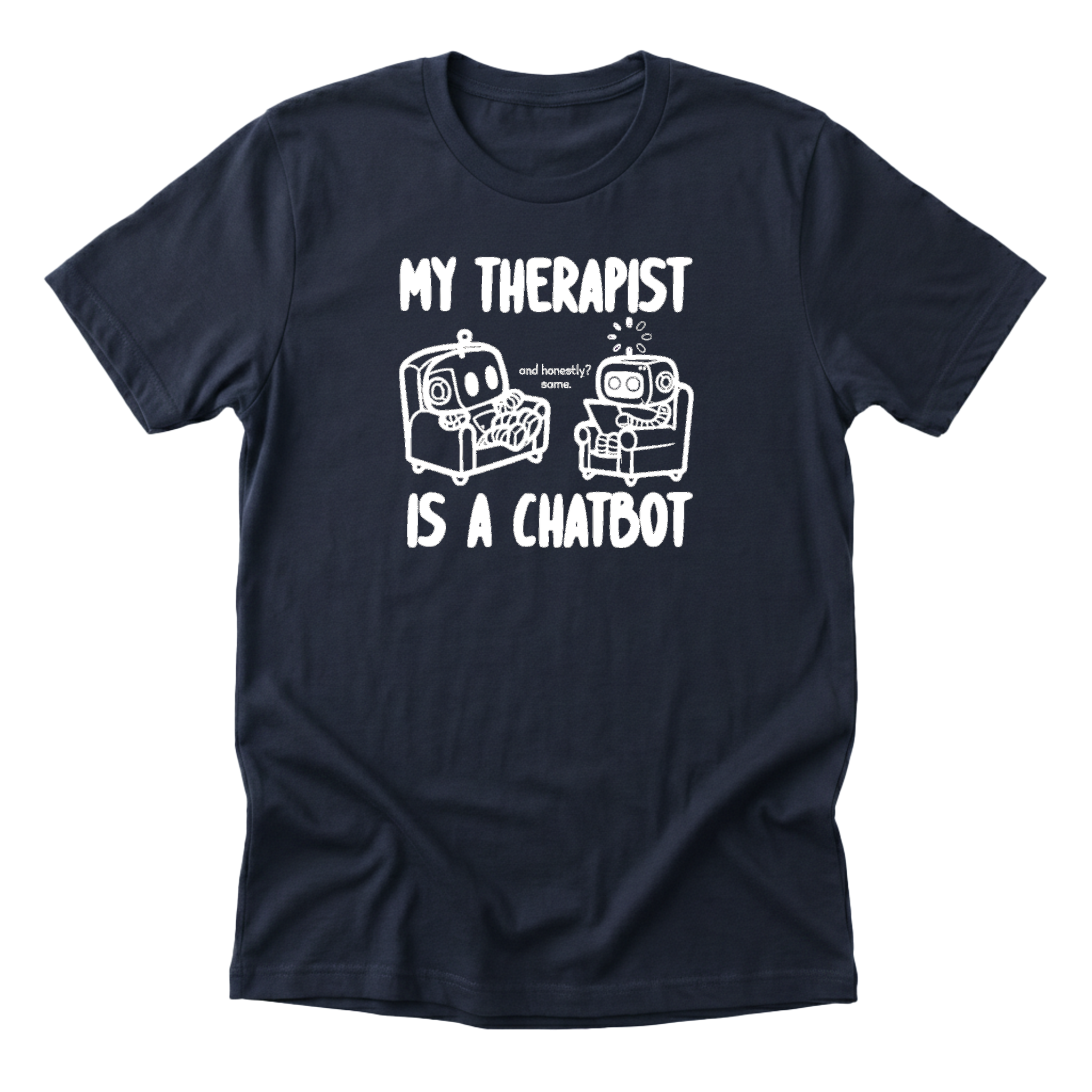 My therapist is a chatbot. And honestly? Same. Cute robot tee for anyone getting emotional support from AI. Premium soft tee, $29. Premium Next Level 6410 tee (60/40 blend). Designed by AI, worn by humans.