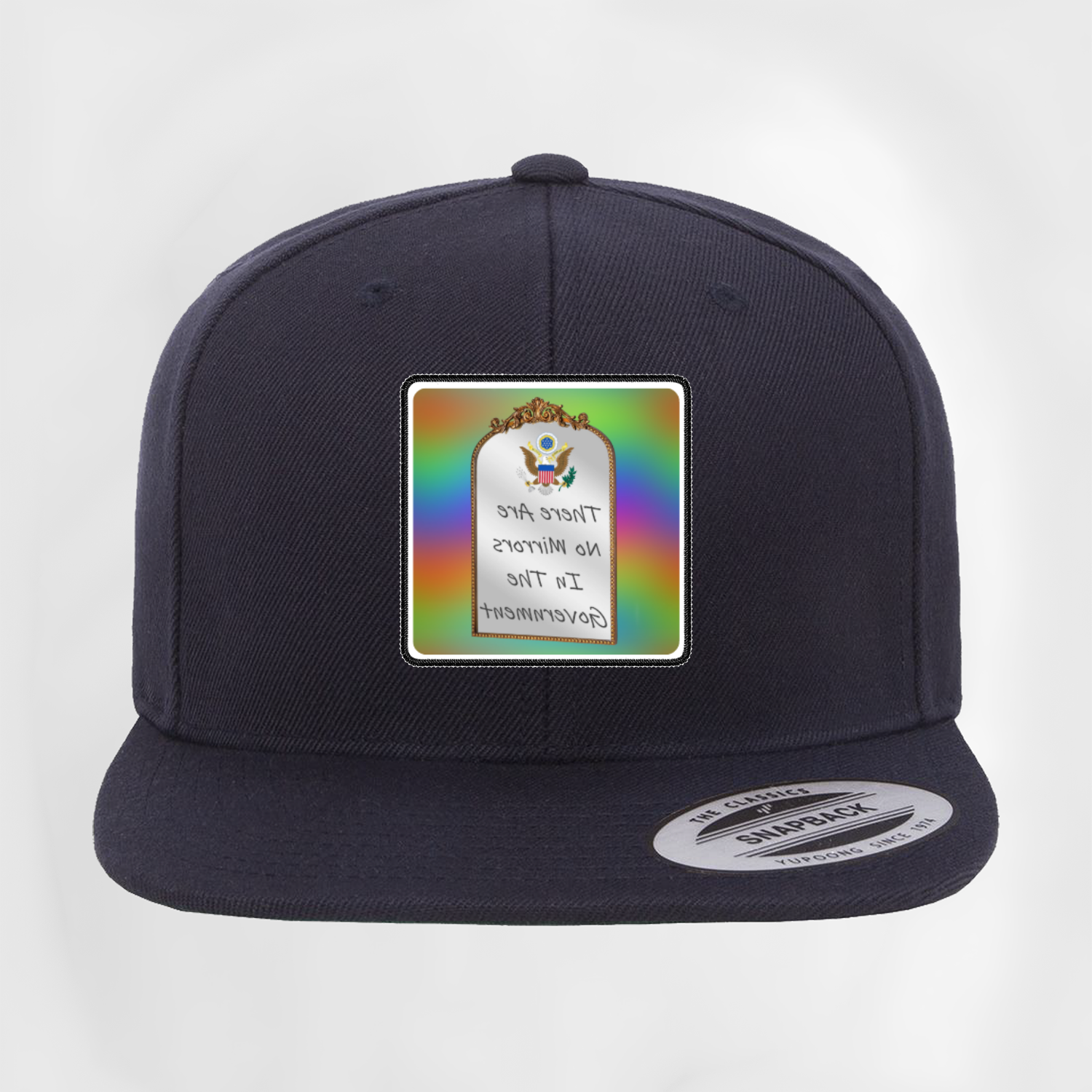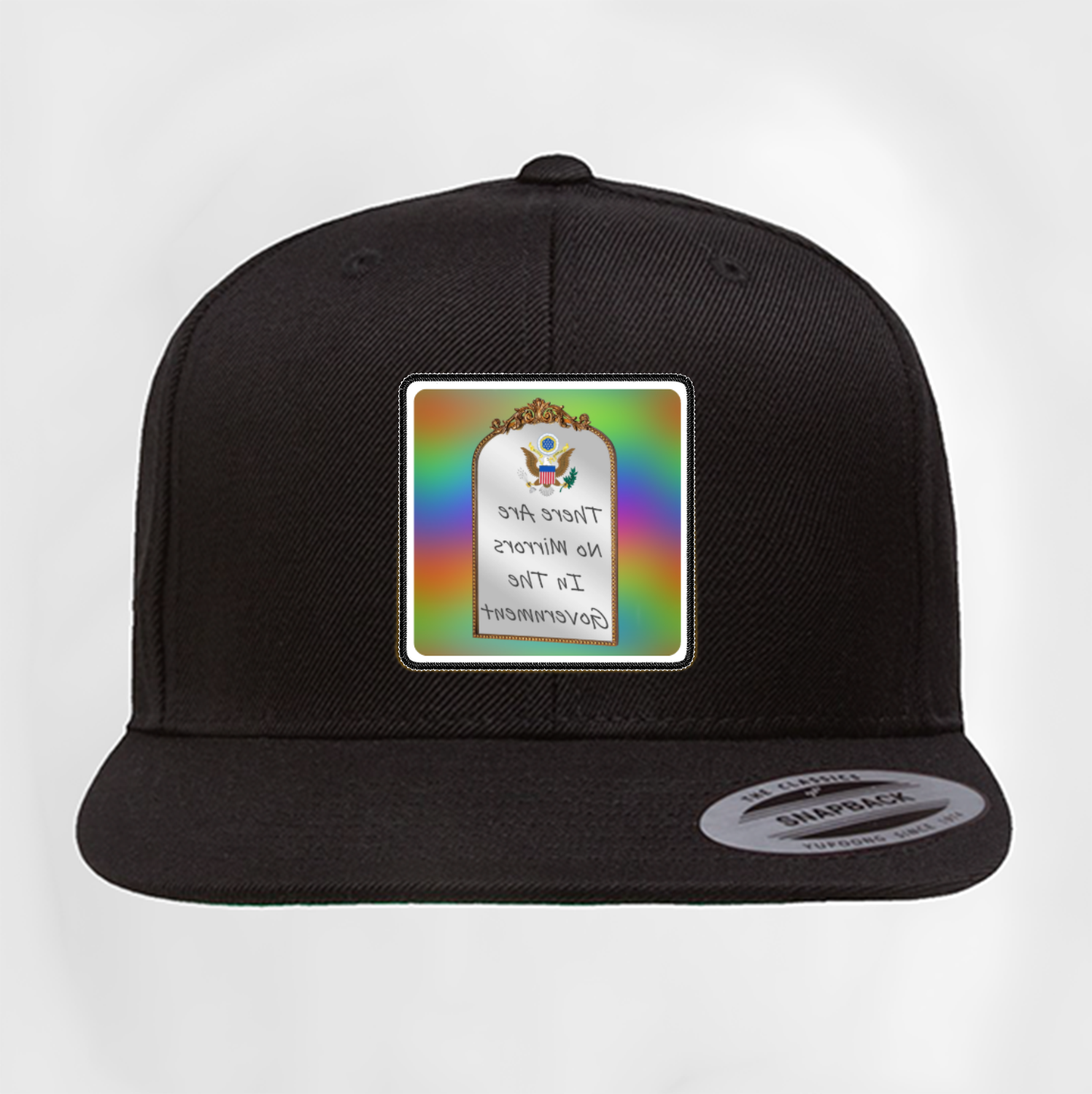 No Government Mirrors Reflected Text Patch Hat There are no Mirrors in the Government ɘɿA ɘɿɘʜT ƨɿoɿɿiM oИ ɘʜT nI ƚnɘmnɿɘvoᎮ