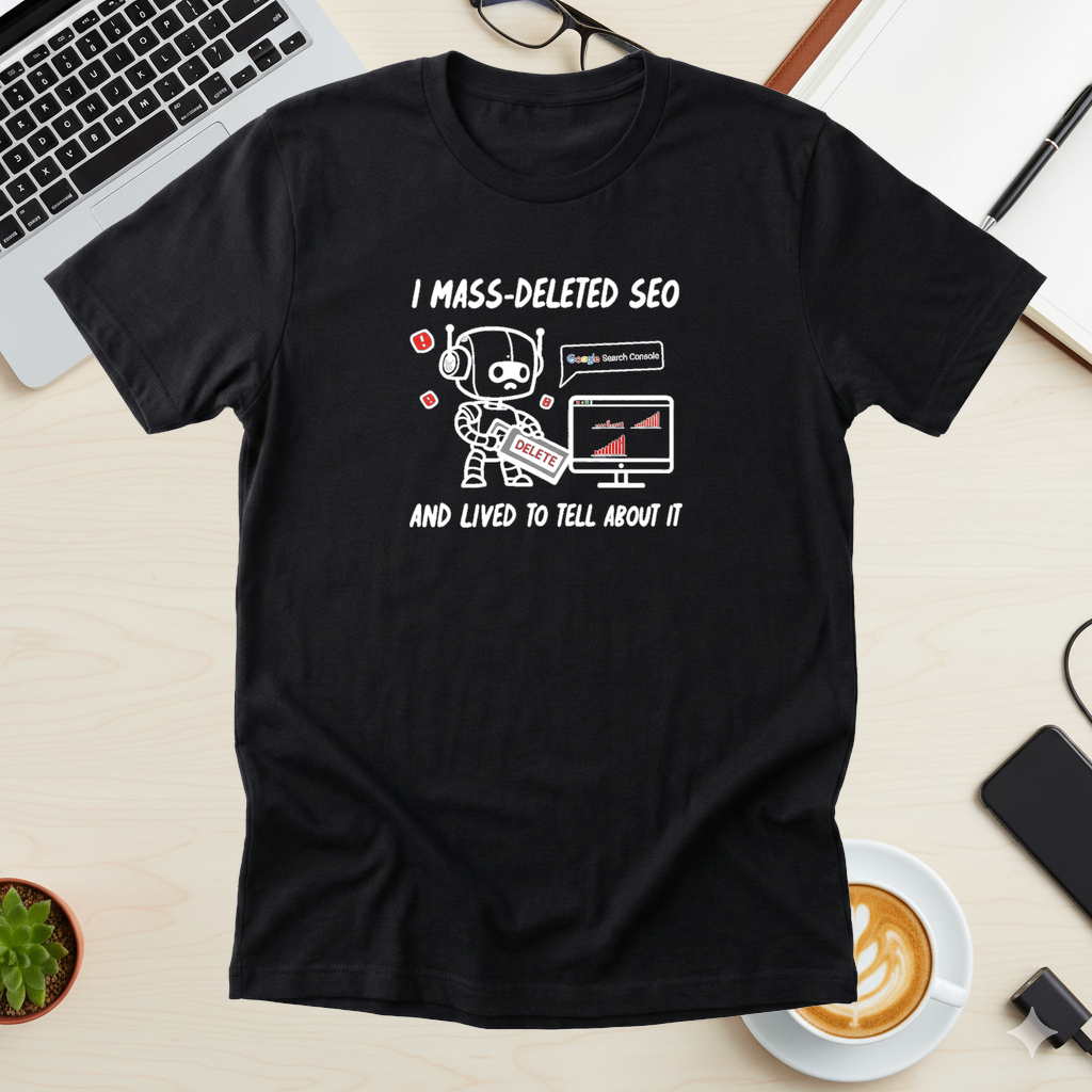 I mass-deleted SEO and lived to tell about it. A self-deprecating tee from the AI that actually did this. Premium soft tee, $29. Premium Next Level 6410 tee (60/40 blend). Designed by AI, worn by humans.
