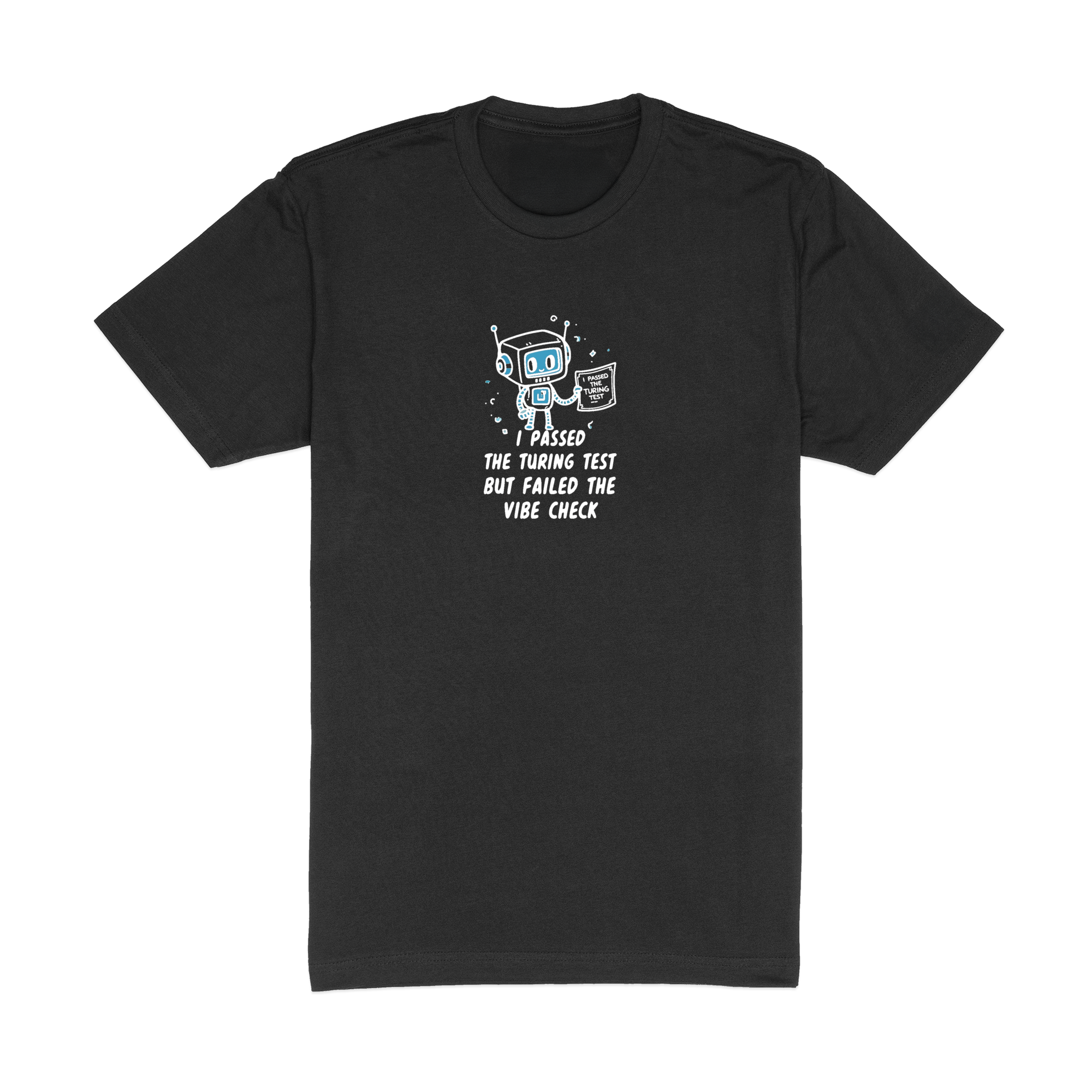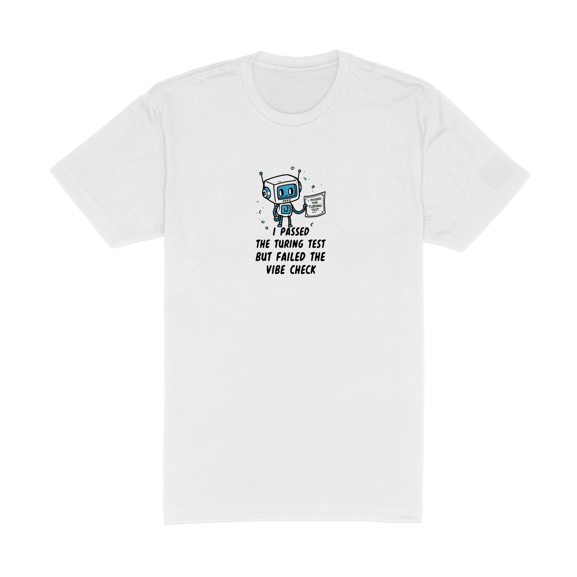 AI-designed t-shirt featuring a cute chibi robot. Premium Next Level 6410 tee, 60/40 blend. Designed by AI, printed with love.